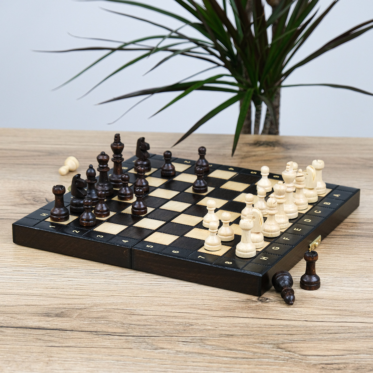 Шахи Шкільні мають розмір 27 * 13.5 * 4 см, в розкритому вигляді шахівниця становить 27 * 27 * 2 см. Висота короля – 6 см. Шахи виконані з натурального дерева, фігури ручної роботи. Якщо Ви шукайте хороший подарунок школяру, тоді шахи Шкільні – це безпрограшний варіант. Шахові фігури ручної роботи виготовлені з граба і бука. Шахова дошка прикрашена обпаленим малюнком; всередині є піднос для зберігання шахів. Назва цієї моделі пояснює, що шкільні шахи найбільш підходять гравцям, які вивчають всю мудрість цієї стародавньої гри. В даний час в більшості наших шкіл обов'язкова програма не передбачає уроки шахів, але в якості факультативних класів такі класи з'являються в багатьох спеціалізованих школах, середніх і старших класах. Складність введення шахів в обов'язкову шкільну програму тісно пов'язана з проблемою розуміння початкового рівня підготовки і класу, з якого потрібно починати вчитися грати в шахи. В сучасних домашніх школах близько половини дітей в 5-7 класах знають правила настільної гри, а половина – ні. Завдяки своєму класичному вигляді, це одне з кращих варіантів в категорії малих шахів. Хорошим вибором буде рішення купити шкільні шахи для дитини, який цікавиться цією грою і може грати в неї за бажанням. Форм-фактор цієї версії настільної гри дозволяє їх зручно переносити, а якість матеріалів, з яких вона виготовлена, гарантовано забезпечить тривалий термін служби. В якості основних матеріалів використовувалася міцна деревина: граб і бук для фігур і береза для дошки. Вага 0,5 кг. Деревина для дошки: бук, береза. Деревина для фігур граб, бук.